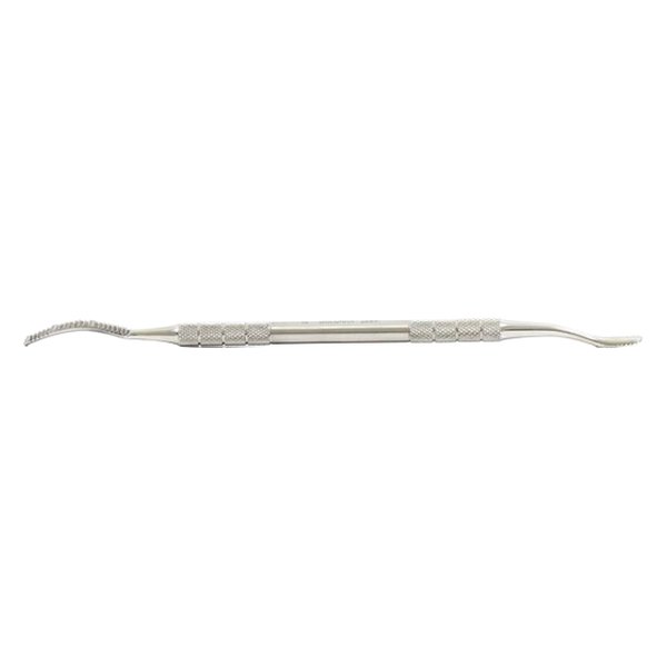 Seu design ergonômico, que inclui um cabo antiderrapante, assegura um manuseio seguro e confortável, além de proporcionar raspagem precisa e eficaz, essencial para cirurgias periodontais, implantes dentários e cirurgias buco-maxilo-faciais.