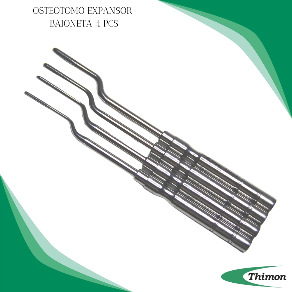 O Osteótomo Expansor Baioneta 4 Peças da Thimon é um conjunto essencial para procedimentos odontológicos avançados, composto por quatro osteótomos não cortantes e não articulados, fabricados em aço inoxidável AISI 420, garantindo durabilidade e resistência excepcionais.